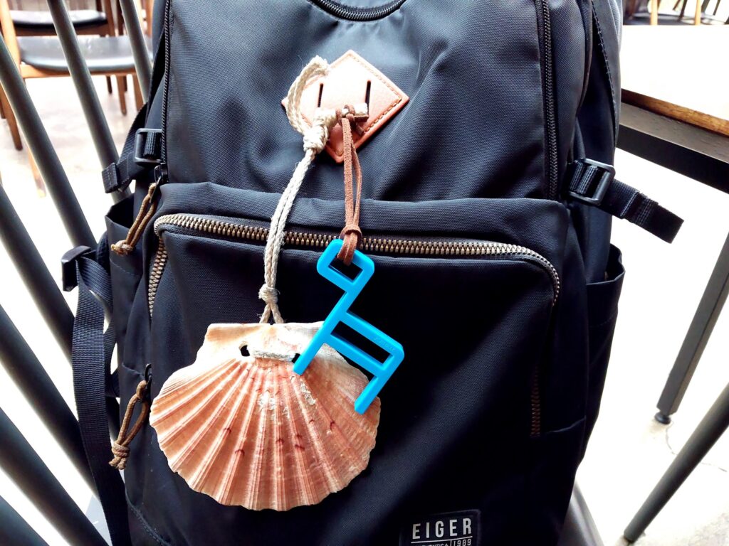 ちなみに、キーホルダーもあるので、こんな感じでホタテ貝と一緒にカバンにぶら下げて歩きます。