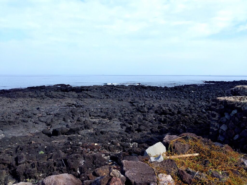 済州島は火山の噴火でできた島なので、海岸は黒い玄武岩で覆いつくされています。