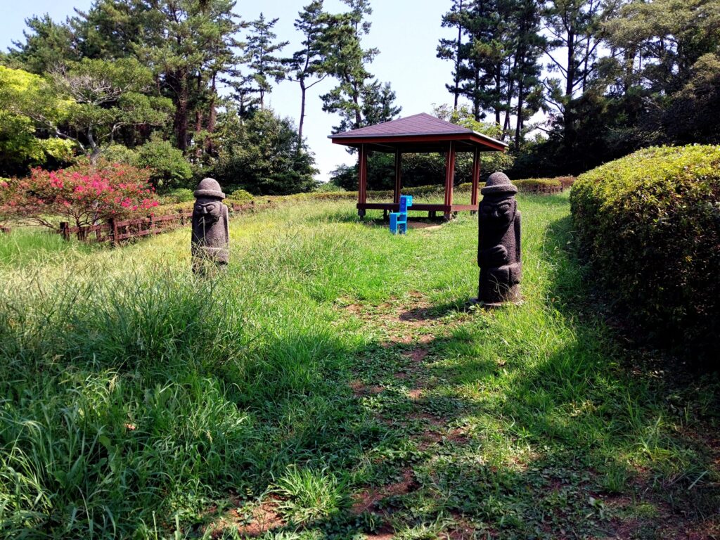 両脇に建っている2対の石像は「トルハルバン」と言いまして、カンセやオレンジと並ぶ済州島のシンボルの一つでもあります。名前の意味は「石の爺さん」。