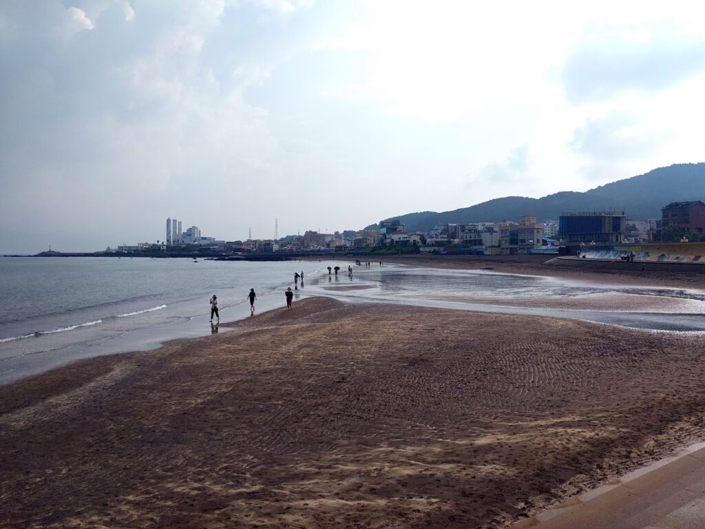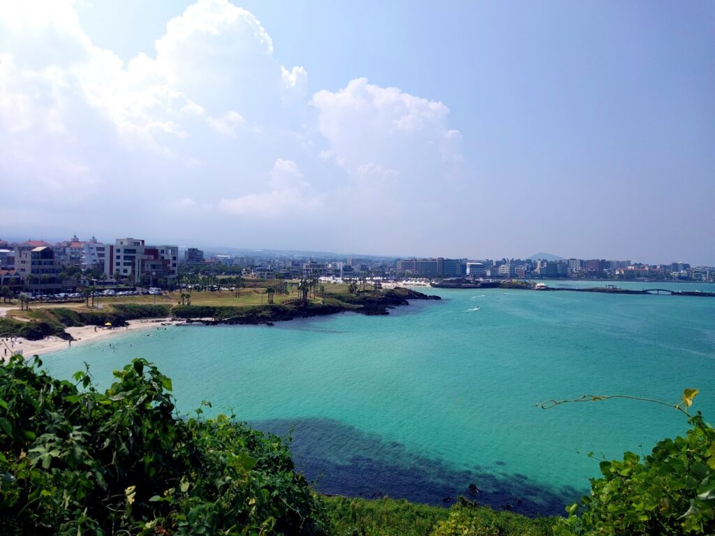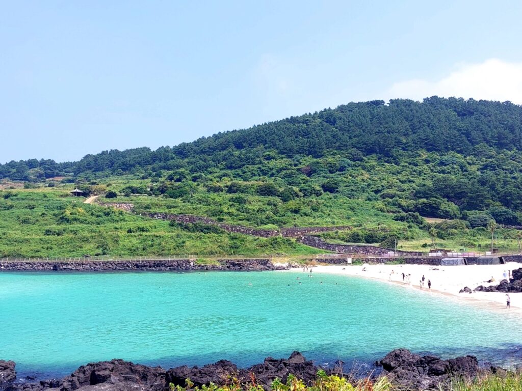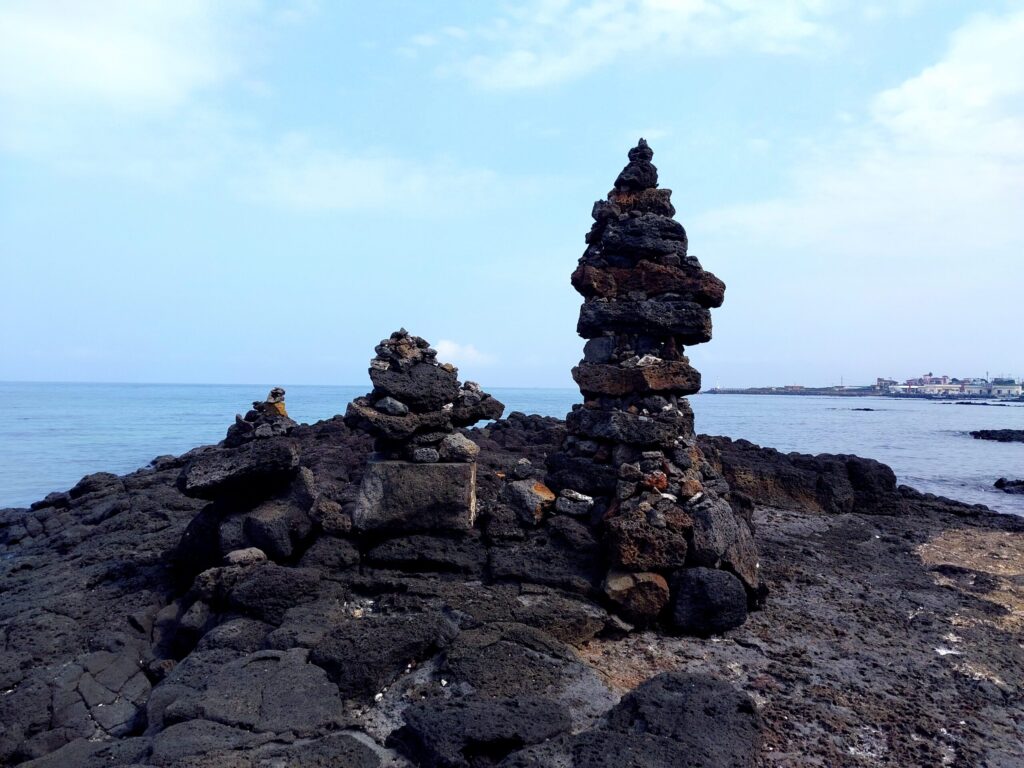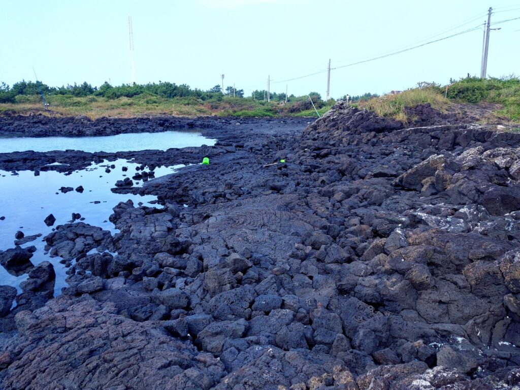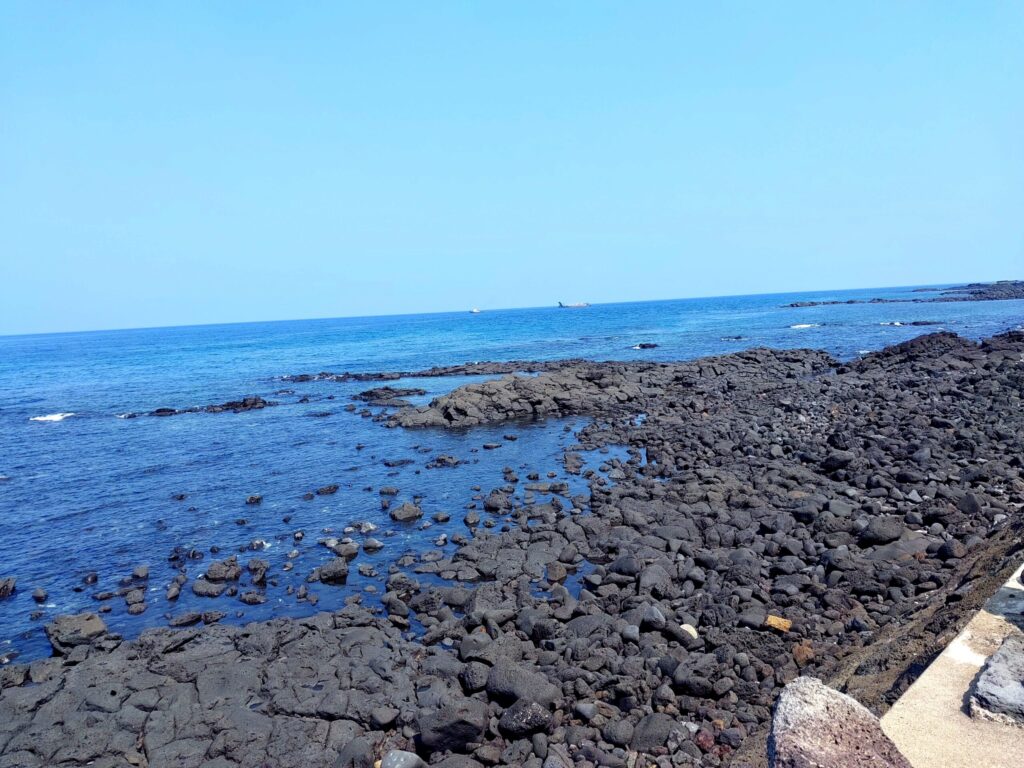 火山の噴火によりできた済州島の海岸はどこも黒い。