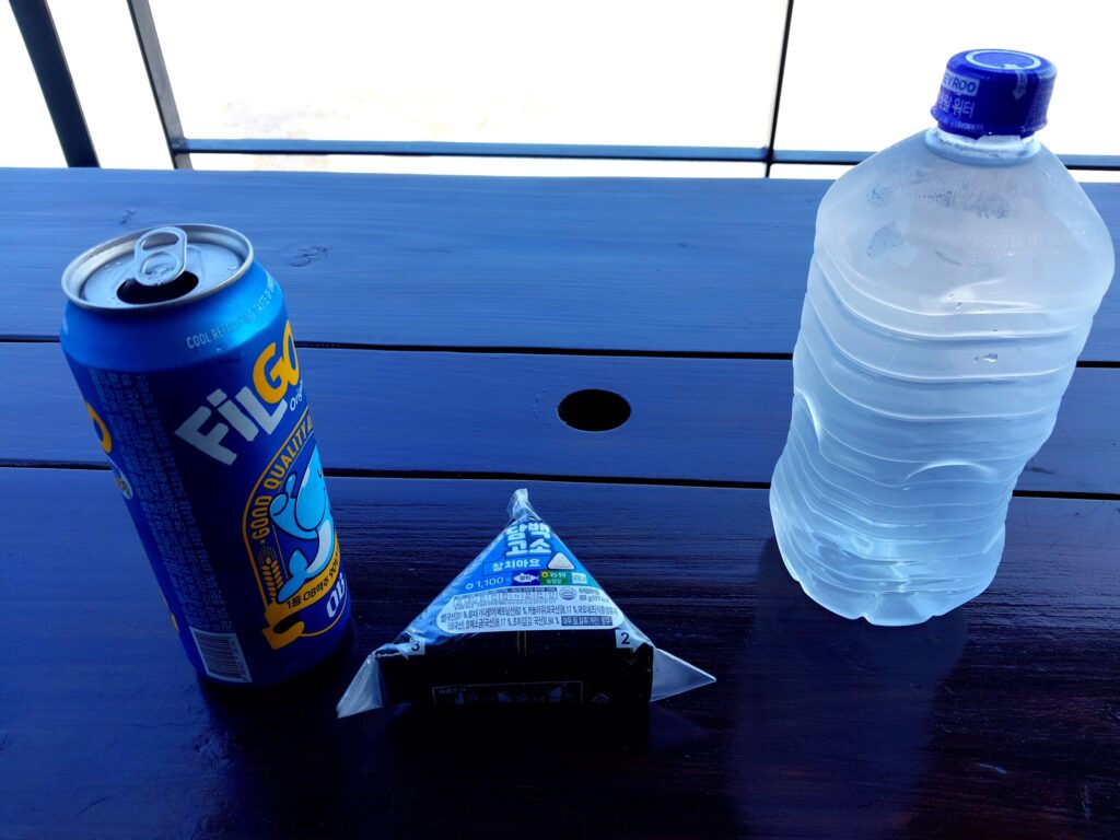 発泡酒とおにぎり、そして水。気温は30℃を超え、いくら水を飲んでも全く足りないのである。