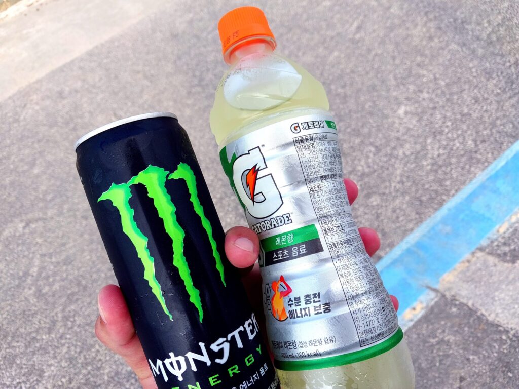 モンスターとスポーツドリンクを流し込む。一瞬だけ生き返った気がするが、数分後にはすべて汗になって体外へ排出される。